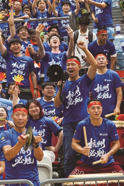 昨晚,在拱墅区运河体育公园体育馆,杭州队以98∶66的比分战胜湖州队,拿下“浙BA”城市争霸赛第三场胜利。图为杭州球迷为比赛加油。商报记者 梁孟澄 摄影报道