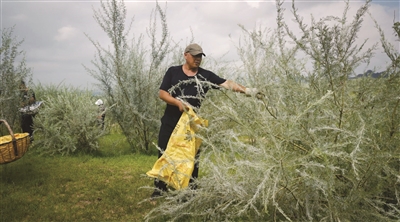 陈金海和乡亲们在蚂蚁森林464号林采摘柠条籽