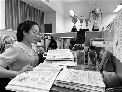 第一节课下课铃声响起,课代表把收好的作业搬来办公室,一个班的历史作业摞起来大概和岳老师办公桌一样高。为了在历史课前完成这些作业的批改,她不得不加快速度。一个多小时,她就像“焊”在了工位上一样,没有起身。