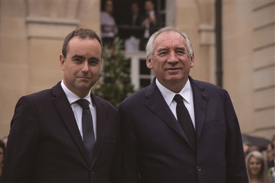 9月10日,在法国巴黎总理府,法国卸任总理贝鲁(右)与新任总理勒科尔尼出席交接仪式。 法国总统府9日晚发布公告说,法国总统马克龙任命塞巴斯蒂安·勒科尔尼为新总理,接替因未能通过国民议会信任投票而辞职的前总理贝鲁。