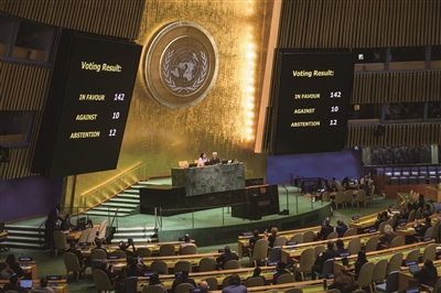 9月12日,在位于纽约的联合国总部举行的联合国大会上,会场显示屏显示投票结果。联合国大会12日以142票赞成、10票反对、12票弃权的表决结果通过一项决议,支持关于和平解决巴勒斯坦问题及实施“两国方案”的纽约宣言。