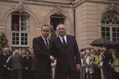9月10日,在法国巴黎总理府,法国卸任总理贝鲁(右)与新任总理勒科尔尼出席交接仪式。法国总统府9日晚发布公告说,法国总统马克龙任命塞巴斯蒂安·勒科尔尼为新总理,接替因未能通过国民议会信任投票而辞职的前总理贝鲁。