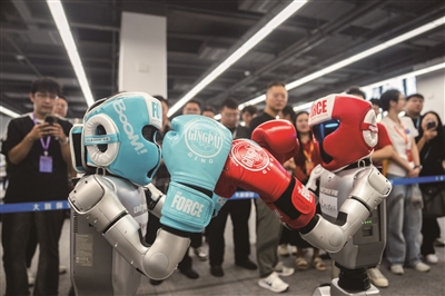 9月15日,在湖南湘江新区长沙智谷,两台人形机器人在进行拳击表演。9月15日,以“AI领航 畅想湘江”为主题的2025互联网岳麓大会在长沙开幕。本次大会聚焦人工智能等前沿技术,将举办大学生创新创业、AI+创新生态、AI+文化、AI+智能网联、AI+工业互联网、AI+营商环境、AI+城市治理、AI+新材料、AI+数字教育9个主题论坛。