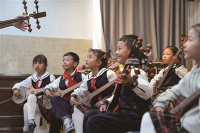 9月11日,西藏拉萨市实验小学的孩子们在弹奏扎念琴。“扎念”在藏语中意为“悦耳之声”。扎念琴俗称“六弦琴”,它历史悠久,在西藏古代壁画与文献中均有记载。2014年,“扎念琴制作技艺”入选第四批国家级非物质文化遗产代表性项目名录。如今,扎念琴走进拉萨中小学的素质拓展课堂与兴趣班,孩子们从小接触、练习扎念琴,悦耳的声音回荡在孩子们的童年里。