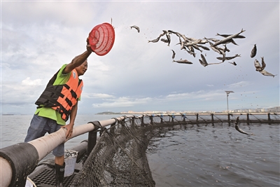 9月17日,海南陵水黄鳍金枪鱼海上养殖示范基地工作人员在投喂金枪鱼。经过数年技术攻关,中国水产科学研究院南海水产研究所已在陵水建成国内首个黄鳍金枪鱼海上养殖示范基地,目前已实现人工产卵孵化,并将该技术推广至陵水,养殖规模上千尾。