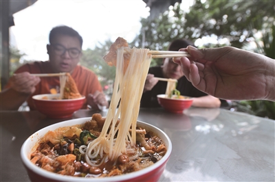 9月14日,市民在广西柳州市一家螺蛳粉店吃螺蛳粉。在第22届中国—东盟博览会上,柳州螺蛳粉因其独特风味而风靡南宁国际会展中心,现场烹饪的、熟食包装的螺蛳粉受到国内外食客的广泛青睐。柳州螺蛳粉是广西特色传统美食。2024年,柳州市螺蛳粉全产业链销售收入超过750亿元。
