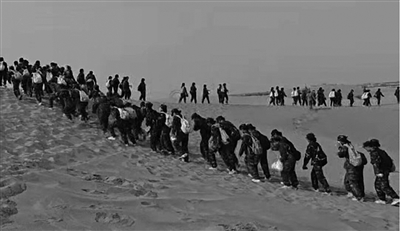 16日下午2时许,老师和教官带领学生们来到沙漠之门景区,景区提前准备好了免费手抓饭,学生们品尝后纷纷表示“手抓饭很香,非常好吃”。餐毕,第一批680余名学生进入沙漠开始拉练,整个行军路程12公里左右,耗时近3小时。