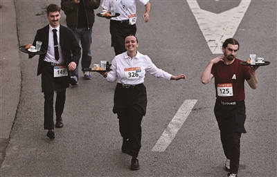 9月21日,法国巴黎举行具有百年历史的服务员赛跑活动。数百名穿着制服的男女服务员手托餐盘,餐盘内放着羊角面包、一个空咖啡杯和一杯水,从巴黎市政厅出发,沿环线跑完4公里的赛程。这是参赛者在赛跑。