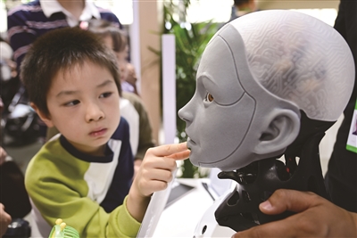 9月21日,小朋友在2025世界制造业大会智能机器人展区和一款机器人互动。20日至23日,2025世界制造业大会在安徽省合肥市举行。大会上,智能机器人展区成为最热门的打卡地,吸引了大批观众前来参观。