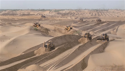 5月22日,在新疆尉犁县境内的塔里木河南岸防沙治沙区,大型机械在平整沙丘(无人机照片)。尉犁县位于塔克拉玛干沙漠边缘,当地通过发展罗布麻产业,“管寸草不生的沙漠要土地”,实现人进沙退、增收致富,探索出一条生态保护与经济发展协同并进的新路。