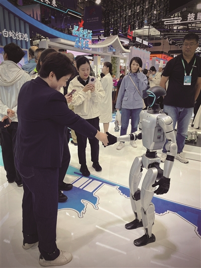 宇树科技的四足机器人以流畅的腾空落地动作瞬间点燃全场。在与观众互动环节,人形机器人响应指令、主动握手,引得观众接连拍照并与它击掌。隔壁“具身智能”赛道同样火爆——云深处科技将爬坡过坎如履平地的全球首款行业级轮足机器人搬到现场,吸引到不少省市代表团纷纷“打卡”。面对山西陈先生关于商场夜间巡检与消防安全应用的咨询,区域销售总监余硕详细介绍了技术参数,轮足瞬间化身“招商名片”,把展台口堵成“小型路演”现场。