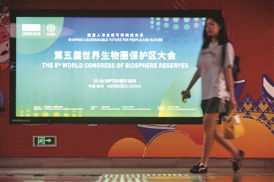 昨天,第五届世界生物圈保护区大会在杭州开幕。9月22日至25日,来自全球150多个国家和地区的约4000名代表汇聚杭州,围绕“塑造人与自然可持续的未来”展开深度对话。图为昨天博览中心地铁站的一处出入口附近,乘客从一块“第五届世界生物圈保护区大会”大屏前经过。 商报记者 项凯 摄影报道