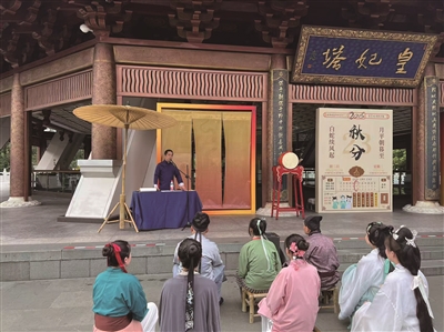 昨天,杭州雷峰塔景区以“说书人传播《白蛇传》”为活动空间,以补全《白蛇传》话本为线索,举办“月平朝暮至,白蛇续风起”秋分国风市集,邀请游客以“叙事参与者”的身份,在沉浸式体验秋分民俗的过程中,在摊位互动中逐步解锁木雕壁画,一起拼凑“白蛇故事”——让古老传说在节气流转中,完成趣味延续。