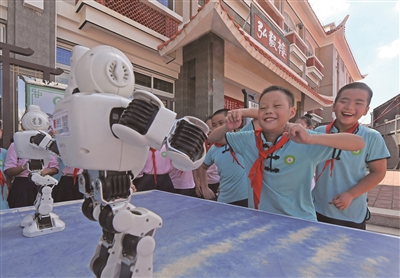 9月25日,福建省泉州市基层科普巡展活动走进泉港区后龙实验小学,现场通过开展科普讲座、无人机表演、机器人舞蹈秀等活动,让师生近距离感受科技魅力。这是后龙实验小学的学生和跳舞机器人开心互动。