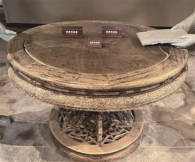 这张圆桌为独腿百灵台样式,台面直径122厘米、高90厘米,底座为束腰式须弥座,中腰挺柱的柱顶与底部均装饰着雕刻传统纹样的站牙。圆桌原主人宋作梅在记录中写道:“受降礼堂设在我家‘赋梅堂’后面一间屋子里,礼堂四周环以白布,上设圆桌,为受降席;下设大菜桌,为日军投降席…… 日军住了我家七年五个月二十日,简直是做了一场噩梦。他们住在我家耀武扬威地屠杀民众的时候,从没有想到,这里恰巧会成为他们垂头丧气、屈膝投降之处。”