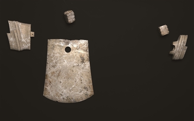 良渚出土的玉器中,豪华型玉钺数量稀少,此套玉钺是目前所见瑁、镦中唯一满器雕琢纹饰的,十分珍贵。