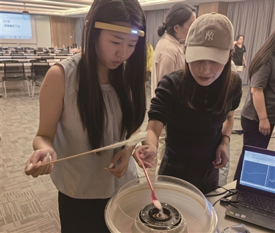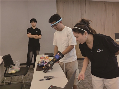 交流团成员佩戴强脑科技的头环制作棉花糖