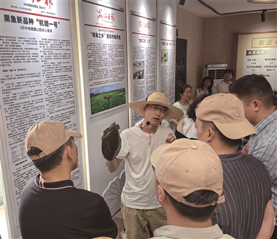 在讲解员的带领下,交流团成员实地走进了生态种养示范区,讲解员俯身掀开饲料台,一只背甲青黑、裙边厚实的生态甲鱼正悠闲划水。“大家可以轻轻触摸感受下,这是我们‘莲鱼共生’模式里自然生长的甲鱼。”随着讲解员的指引,中共九龙县委办公室的邱红英伸手触碰甲鱼背甲。“这裙边摸起来好有弹性!难怪市场上卖得这么俏,生态养殖的品质果然不一样!”成员们一边观察甲鱼在水中灵活游弋的姿态,一边赞叹道,“以前只在餐桌上见过,没想到能亲手接触,这种‘看得见的生态’太有说服力了!”
