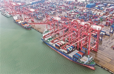 10月13日,在江苏省连云港港集装箱码头,货轮在装载出口货物。