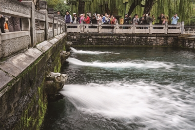 10月15日,游客在山东省济南市黑虎泉观光游览。受近期降雨影响,济南市群泉奔涌,吸引游客前来观赏。