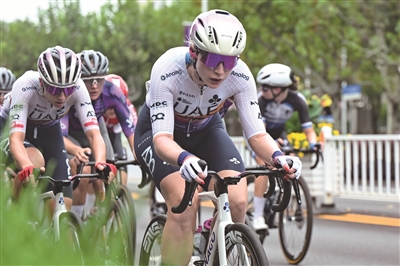 10月16日,2025年环崇明岛国际自盟女子公路世界巡回赛第三赛段(崇中赛段暨城市绕圈赛)在上海市崇明区举行。这是参赛选手在比赛中骑行。