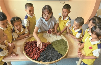 10月16日,在湖南省永州市道县城南幼儿园,老师带着孩子们了解各类粮食知识。当天是第45个世界粮食日,多地学校开展爱粮惜粮教育活动。今年世界粮食日的主题为“手拉手共倡多样美食,聚合力同创美好未来”。