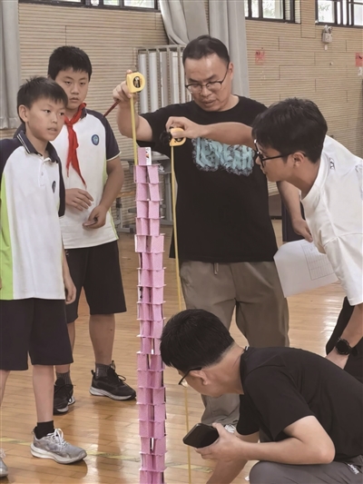 “头脑奥林匹克·叠叠高”集体赛在行健馆举行,考验团队协作与操作技巧。每班3名选手组队,其中1人任组长,统筹操作。选手仅能用学校提供的两副扑克牌,在30分钟内尝试叠高,最多3次机会,取最高有效高度为成绩。每次测量前,评委倒计时5秒检验稳定性——不倒方为有效,充分考验选手的默契与精准。