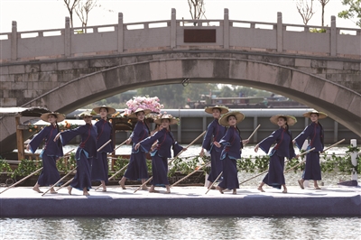 10月24日,为期5天的第二季新市古镇舞蹈艺术季在湖州市德清县新市古镇开幕。这是浙江音乐学院表演者在新市古镇南栅漾表演舞蹈《烟波唱晚》。