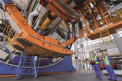 10月24日,由中铁十四局和铁建重工集团联合打造的“龙岗二号”盾构机在湖南长沙下线。这台盾构机整机长约117米,总重量约3600吨,开挖直径14.31米,将应用于深汕高铁龙岗隧道建设。这是工人在铁建重工长沙第一产业园调试“龙岗二号”盾构机。