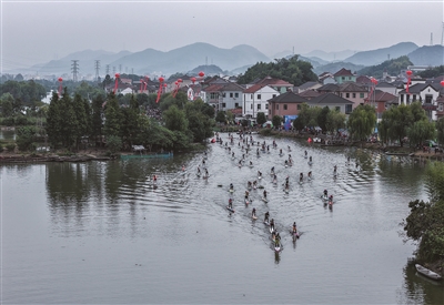 10月26日,2025白塔湖湿地皮划艇桨板邀请赛在绍兴诸暨市店口镇白塔湖国家湿地公园举行,来自全国的250多名皮艇及桨板运动爱好者参加了本次比赛。这是参赛选手在桨板比赛中(无人机照片)。