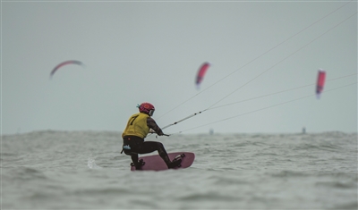 10月26日,第十五届全运会帆船项目第二阶段比赛在广东省汕尾市继续举行。这是福建队选手陈静乐在女子水翼风筝板级第二阶段比赛中。