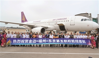 10月26日,福建省首条第五航权客运航线“金边—福州—东京”航线正式启航。第五航权指一个国家的航空公司在经营某条国际航线的同时,获得在第三国经停并载运客货的权利。一旦开放第五航权,意味着航空公司可以在第三国载运客货,实现三个国家之间运输。这是在福州长乐国际机场停机坪拍摄的首航庆祝仪式。