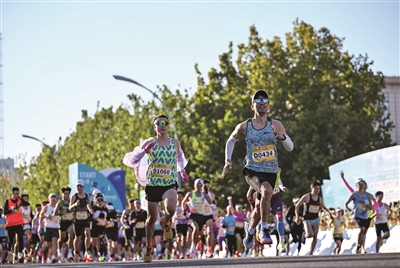 10月26日,2025天津马拉松鸣枪开跑,赛事吸引了约3万名跑者参加。这是参赛选手在比赛中。