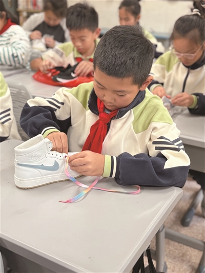商报讯(记者 夏莹)一个寻常的周四课间,文渊小学新城校区的操场上,孩子们正在活动。五年级班主任胡佳乐留意到这样一幕:一个男孩的裤腰带松了,他并未立刻自己系上,而是向身边的同学求助:“帮我系一下。”然而,那个同学也不会系。