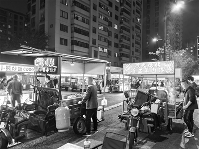 对于夜市不断“侵占”小区出口的情况,小区保安老翁也颇为无奈。他介绍,这处夜市原本集中在上塘高架桥下,后来餐车越来越多,夜市的规模也越来越大,现在已经摆到小区门口了,一些业主的车辆转弯进小区都困难。“我们对这些摊主屡次劝阻,但收效不大,一些夜市摊主还会因此和我们吵架。”一面是业主的投诉,一面是摊主的我行我素,老翁也无可奈何。
