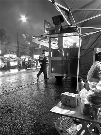 餐车旁的行人道则摆放着遮蔽风雨的大帐篷供顾客落座就餐,来往行人无法通行,只能走在机动车道上,进一步加剧了道路通行难度。一位路人表示,遇到晴天大家还能贴着夜市摊位走路,到了下雨天打着伞,车来车往非常不方便更不安全。