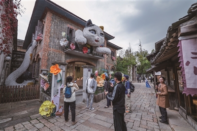 游客在濮院时尚古镇的互联网生活嘉年华观看巨型萌宠装置。11月5日至9日,浙江省嘉兴市桐乡濮院时尚古镇举办互联网生活嘉年华活动。本次互联网生活嘉年华聚合“灵感生活集、潮玩引力场、大有未来街”三大主题单元,活动聚合数智体验、AI产品、智能家居、潮流品牌与沉浸式娱乐等多元内容,转化为游客可触摸、可互动、可消费的日常产品与娱乐体验。