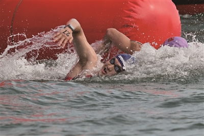 11月6日,在广东省深圳市举行的第十五届全运会男子10公里马拉松游泳决赛中,湖北队选手张子扬以1小时59分55秒3的成绩夺得冠军,山东队选手刘培鑫和福建队选手兰天辰分别获得亚军和季军。这是刘培鑫(左)在比赛中。