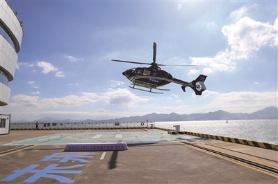 11月6日,深圳国际邮轮母港正式启用跨境直升机出入境功能。两架次跨境直升机搭载着首批乘客,先后完成从澳门国际机场至蛇口、从蛇口至香港信德直升机场的飞行。两条航线正式运营后,深圳蛇口至香港岛、澳门的在途交通时间将分别缩短至20分钟和15分钟以内。这是从澳门国际机场起飞的直升机飞抵深圳国际邮轮母港直升机停机坪。