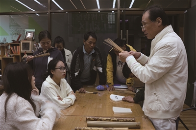 交流团成员在杭州工艺美术博物馆体验定制折扇制作