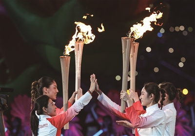 火炬手郭晶晶(前左)、王欣瑜(后左)、王柳懿/王芊懿在开幕式上进行火炬交接。