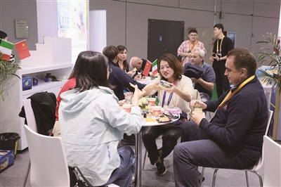11月7日,在第八届进博会农食产品展区,意大利伊纳尔皮集团(Inalpi)董事长安布罗焦·因韦尔尼齐(前右)和合作伙伴洽谈。此次进博会上,多家意大利知名农食企业集中亮相,带来黄油、奶酪、饼干、葡萄酒等食品和饮品,期待寻求销售与合作的双赢。