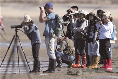 11月9日,中外观鸟爱好者在福建泉州晋江的围头湾滩涂上观测勺嘴鹬。近日,在晋江围头湾,观鸟爱好者发现勺嘴鹬的踪迹。勺嘴鹬是国家一级保护野生动物,分布区域狭窄、数量稀少,是全球最濒危的鸟类之一。
