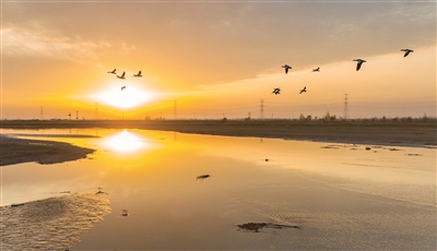 11月11日,候鸟在宁夏石嘴山市平罗县境内的天河湾国家湿地公园上空飞翔(无人机照片)。天河湾国家湿地公园紧邻黄河,随着黄河流域生态环境不断改善,如今这里已成为候鸟的栖息乐园。