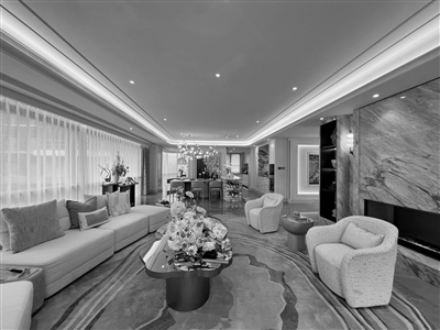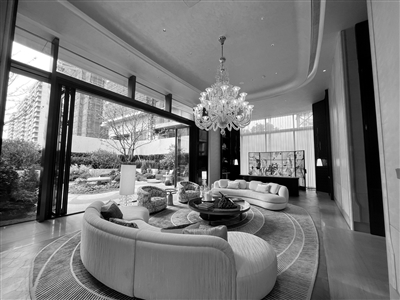 这个项目整体设计风格偏向“老钱风”,色彩相对重一些,全盘用了很多奢石。园区内做了480平方米的下沉式庭院和约1500平方米的会所,包含恒温泳池、健身房、私宴厅、女王空间、棋牌房和室内高尔夫球馆,功能丰富。同时,在园区内还有滨江标志性的蓝宝石水池。