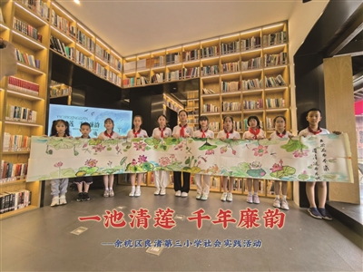 良渚第三小学充分挖掘良渚安溪古镇特有的“廉池”文化资源,将廉洁教育从课堂延伸到自然与历史现场。课程以“廉池育青莲”为主题,组织三至五年级学生走进安溪玲珑书屋与廉池荷畔,围绕“赏莲、说莲、赠莲、画莲”四大环节开展实践教学。