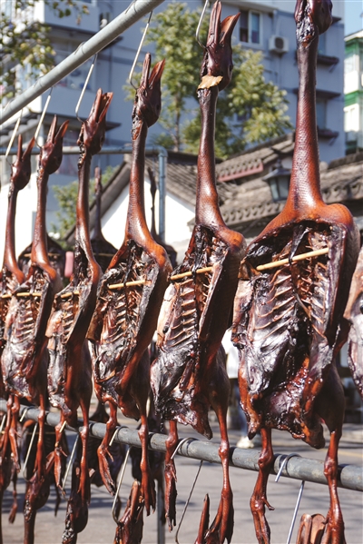 入冬后,气温骤降。杭州街头,一排排整齐晾挂的酱鸭形成一道独特的风景线。昨天上午,天气晴好,杭州察院前巷的一家家酱鸭店门口,数十只酱鸭一字排开,油光锃亮,酱香萦绕,俨然一幅生动的市井画卷。在文娟酱鸭店,“现在每天可以卖60只酱鸭,还有客户已提前预订了80只。”老板韩玲告诉记者。商报记者 项凯 实习生 李沣 摄影报道