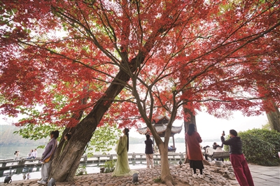 近日,杭州长桥公园的夕影亭旁,有一棵枫树率先变红了。这棵红枫离西湖特别近,它对着夕影亭和雷峰塔,抬眼望去,红叶如焰,灿若流霞,形成初冬西湖边一道独特的风景线,吸引很多游客驻足拍照。商报记者 项凯 摄影报道