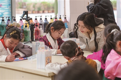 松鲜鲜创始人易子涵女士与雅江县城关第一完全小学学生共绘爱心。