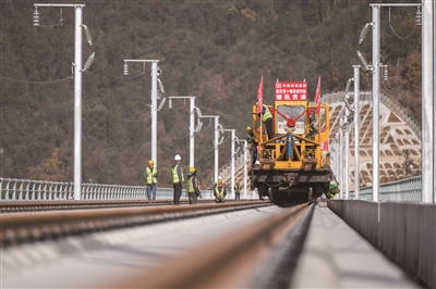11月27日,在湖北十堰神定河特大桥上,西安至十堰高速铁路全线最后一对长钢轨铺设落地,标志着西十高铁全线铺轨工程顺利完工,为后续联调联试奠定基础。西十高铁开通后,西安至十堰将实现1小时内到达,武汉至西安的铁路运行时间将压缩至2.5小时左右。这是工人在湖北十堰神定河特大桥施工。